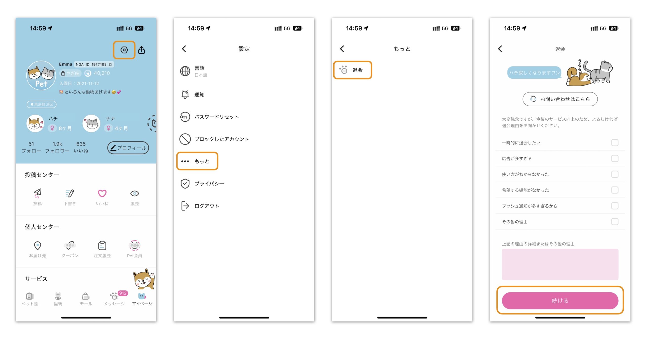 ユーザーご自身でアカウントを削除したい場合は、アプリ内の「マイページ」から右上の「設定」をタップし、「もっと」→「退会」→「続ける」の順番で、ボタンをタップすると、退会手続きが完了します。